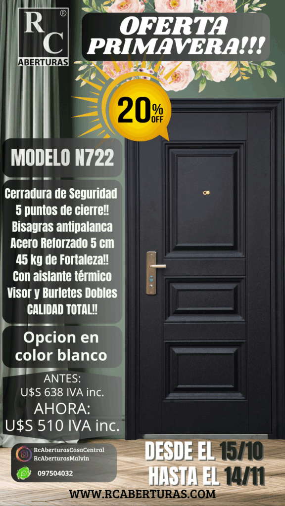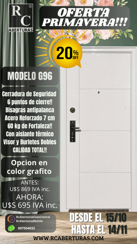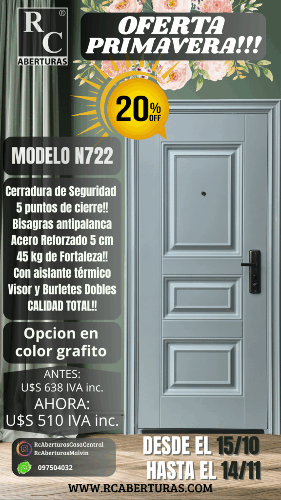 Accesorios adicionales: Barral en acero, contramarcos, umbral, cerradura de triple buje, cerrojos extra de Seguridad.