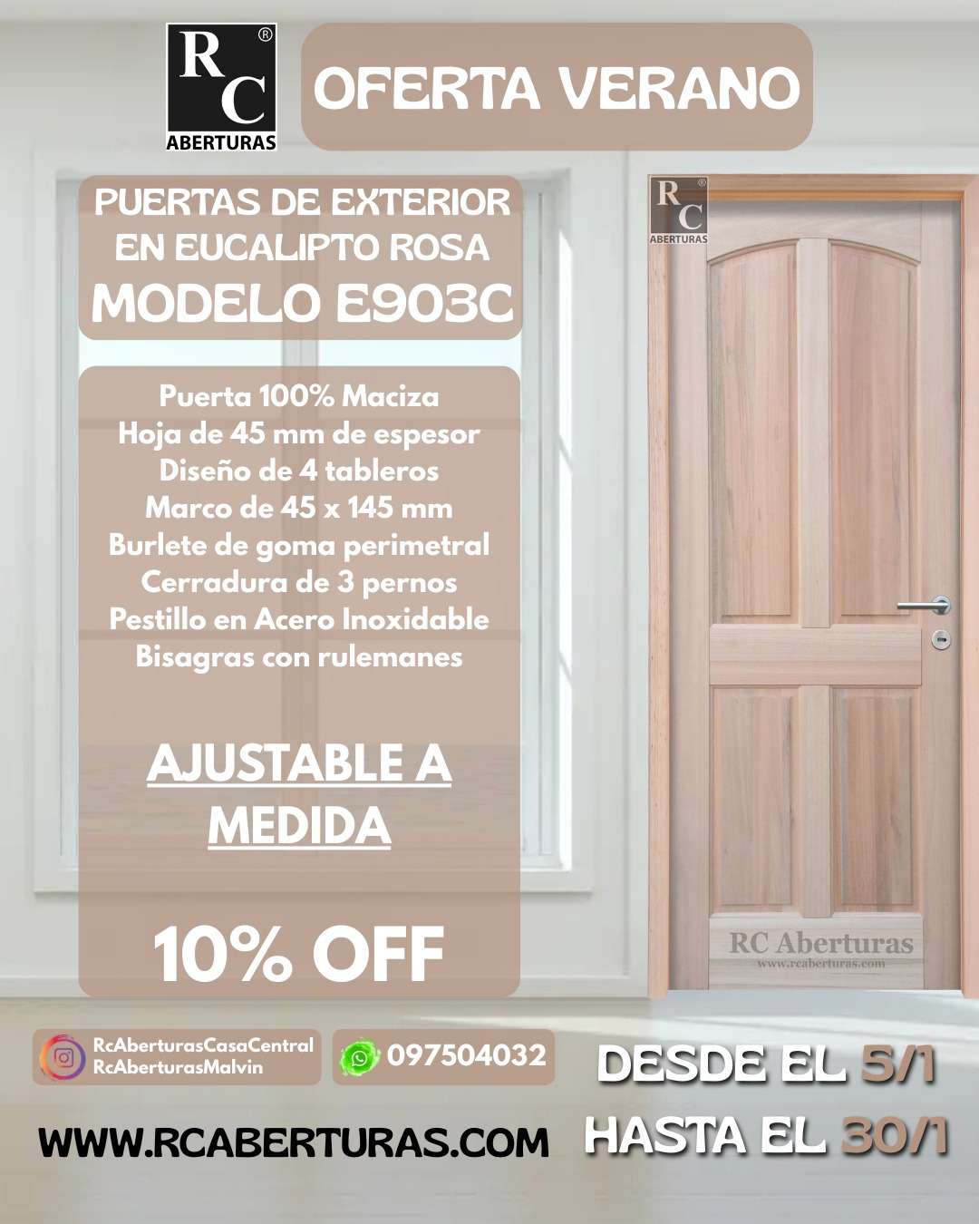 Accesorios adicionales: Barral en acero, umbral macizo con desagües, cerradura de triple buje, burlete de goma en el marco para mayor hermeticidad, cerrojos extra de Seguridad, visor óptico, contramarcos o tapajuntas.